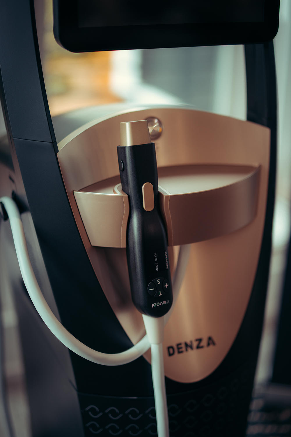 Denza's monopolar and bipolar radiofrequency technology, featuring sequential pulsing, effectively stimulates collagen and elastin production in the skin. This leads to a marked enhancement in skin tightness and overall rejuvenation, helping you look and feel more youthful.